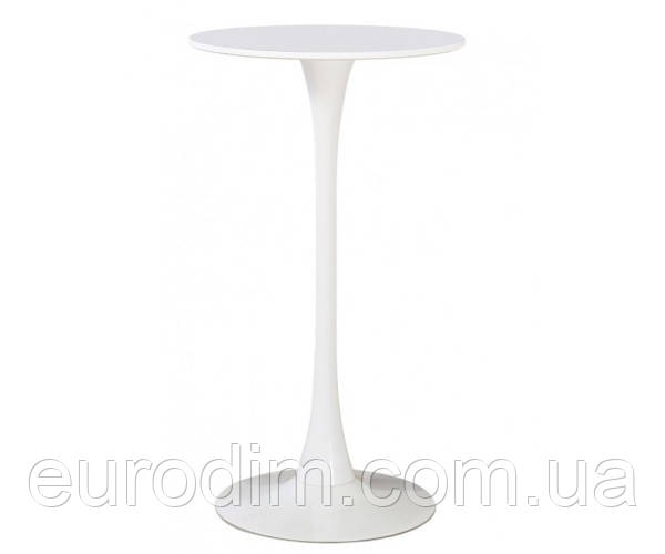 Стіл високий барний, стильна та дизайнерська модель, яка стане прикрасою сучасної кухні або бару, стільниця кругла з матеріалу МДФ ламінована, діаметр стільниці 60 см, товщина стільниці 15 мм, опора з металу, фарбована в білий колір, діаметр основи унизу 50 см, висота столу 105 см.